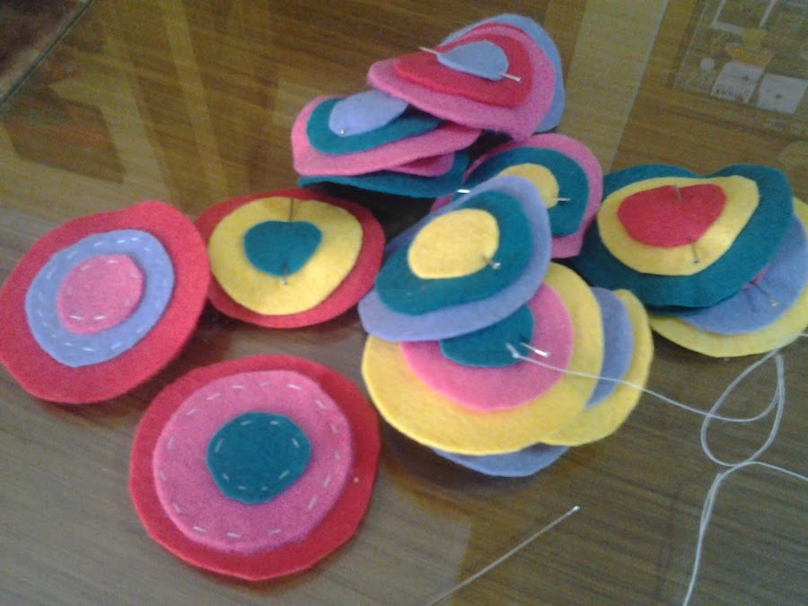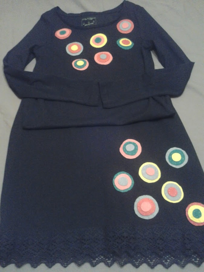 Recorté circulos en varios tonos y fui cosiendo, luego los cosí a la camiseta y a la falda, y este fue el resultado....