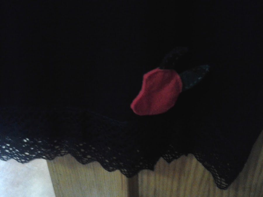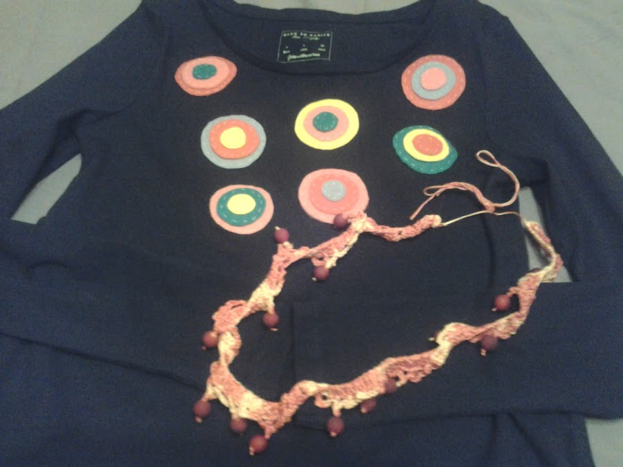 Hola, mis tesoros, compré una camiseta negra básica, y una falda tambien negra, a la que le había puesto una puntilla y una manzana de fieltro; pero cuando lo saqué del armario, no me gustaba ver tanto negro !, aunque sea invierno, me apetecían los colorines. Entonces fue cuando se me ocurrio hacer unos mandalas de fieltro y coserlos al conjunto, no sabía si me iba a gustar el resultado, pero como me encantan los colores, me lancé....