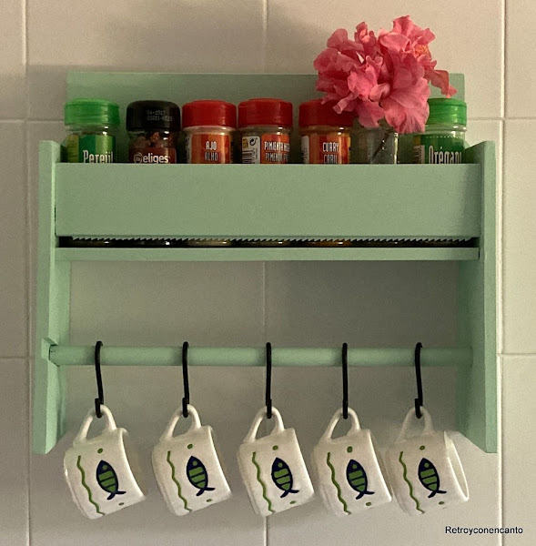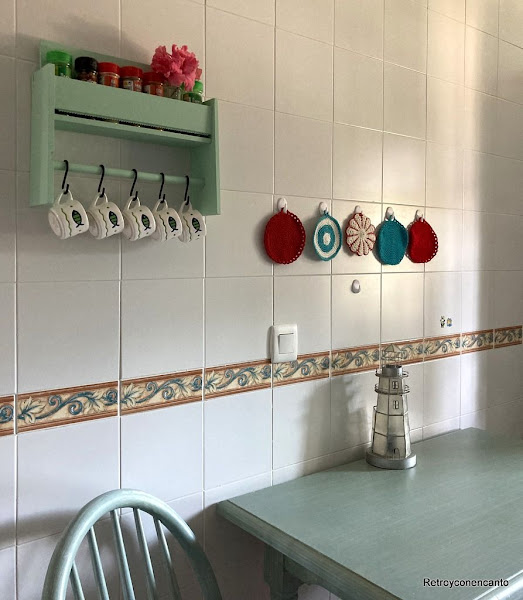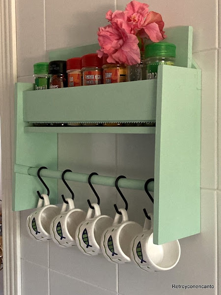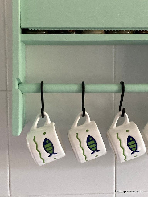 Además, en la barrita de madera hemos colocado unos ganchos donde colgar pequeñas tazas de café.