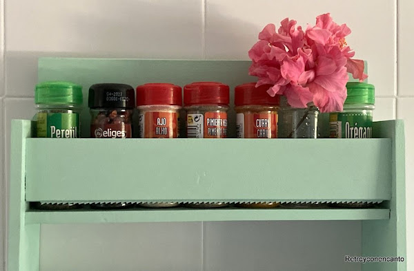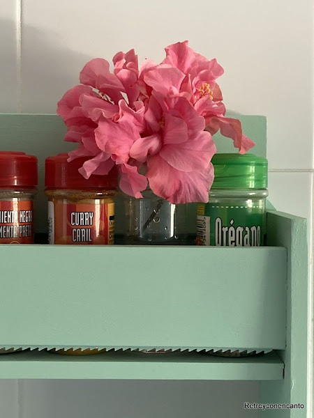 Para nuestra sorpresa, la estantería resultante parece hecha a medida de los botes de especias, incluso hemos recuperado uno vacío que nos sirva de florero.