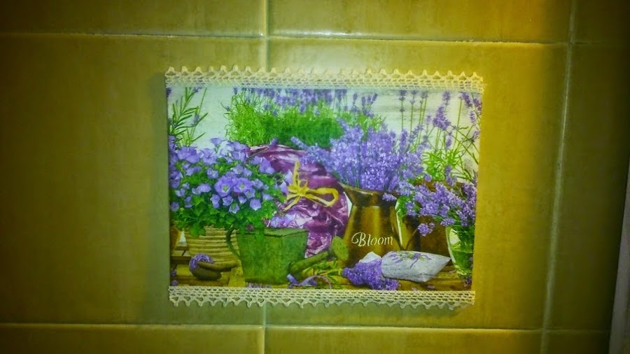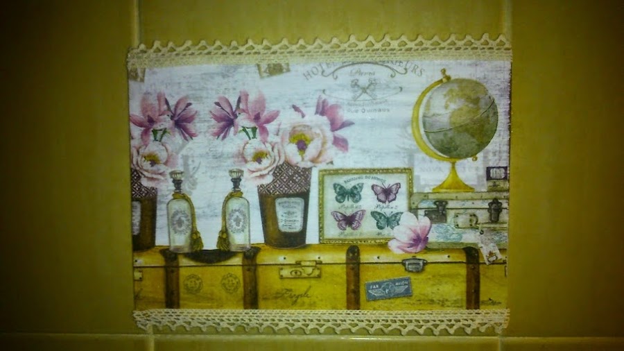 Y con unos resto de tabla que tenia guardado, hice estos cuadritos con puntillitas y servilletas