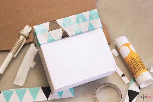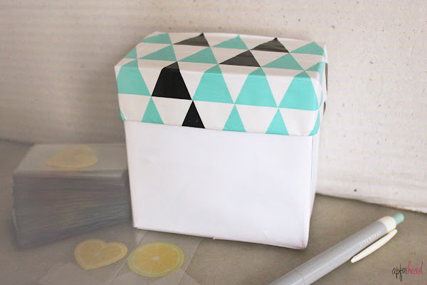 Primero he forrado toda la caja con folio blanco para tapar la propaganda y dejarla de un mismo color. En la parte de la tapa he gastado un papel estampado en blanco, negro y turquesa, que es lo que le da el toque de color.