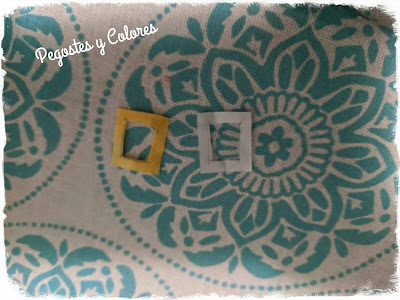 3.- Desprendemos el papel y colocamos las figuras con el lado del adhesivo sobre la tela donde queremos que quede fijo, en mi caso es un rectángulo que mide 260 cm de largo X 70 cm de ancho doblado por lo largo sobre si mismo (para que quede una pieza de 260cm X 35 cm). Coloque mi regla para dejar centrada mas o menos mis figuras y dejar el mismo espacio de la orilla del camino hacia donde quería que estuviera.