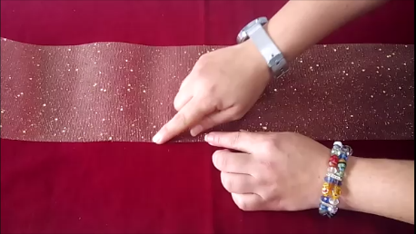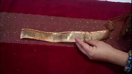 La cinta que usé es de las que normalmente se usan para hacer lazos o moños, de las que traen un alambre fino por los bordes. Utilicé este tipo de cinta porque no encontré un vivo o bies dorado o con motivos navideños como lo quería, así que probé con ésta cinta y quedé bastante satisfecha con el resultado.