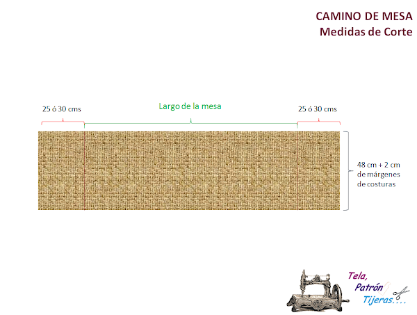 Ten en cuenta que siempre debes añadirle unos 50 ó 60 cm al largo de la mesa, de forma que cuelgue entre 25 ó 30 cms. por cada lado. Tal y como indicamos en este diagrama: