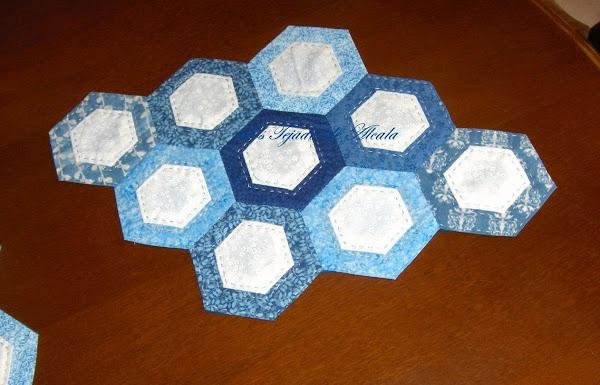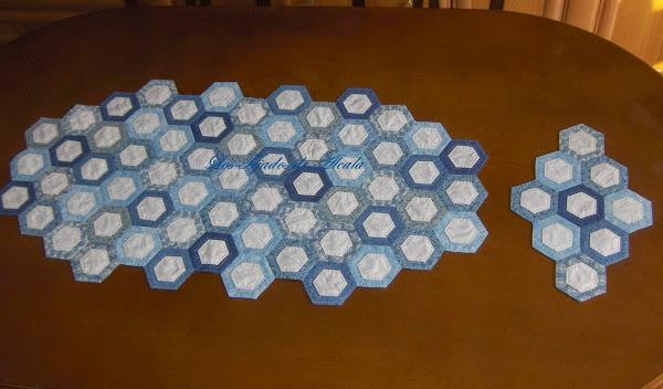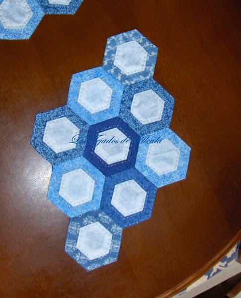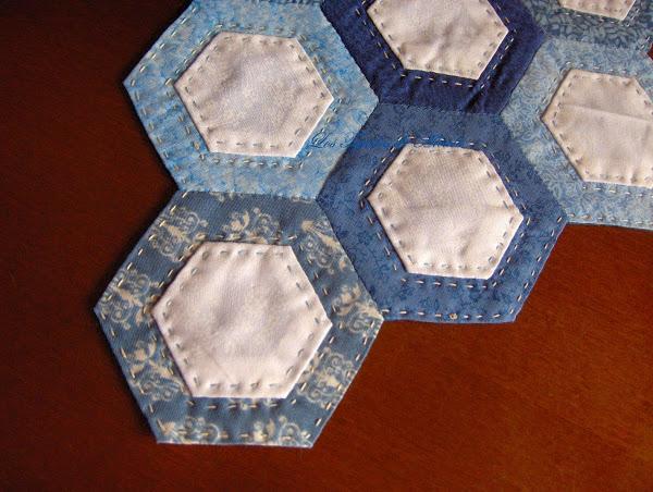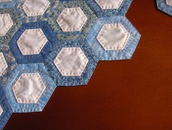El acolchado es a mano, en eco, alrededor y dentro de los hexágonos pequeños.