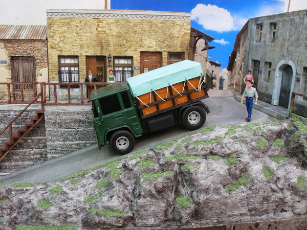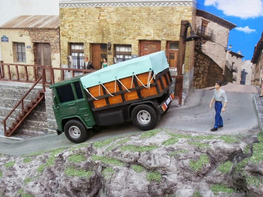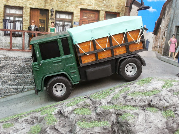 La caja esta totalmente construida a mano con los materiales que habitualmente utilizo y la lona es una hoja de papel color verde, unas calcos y pintura para darle mas realismo.