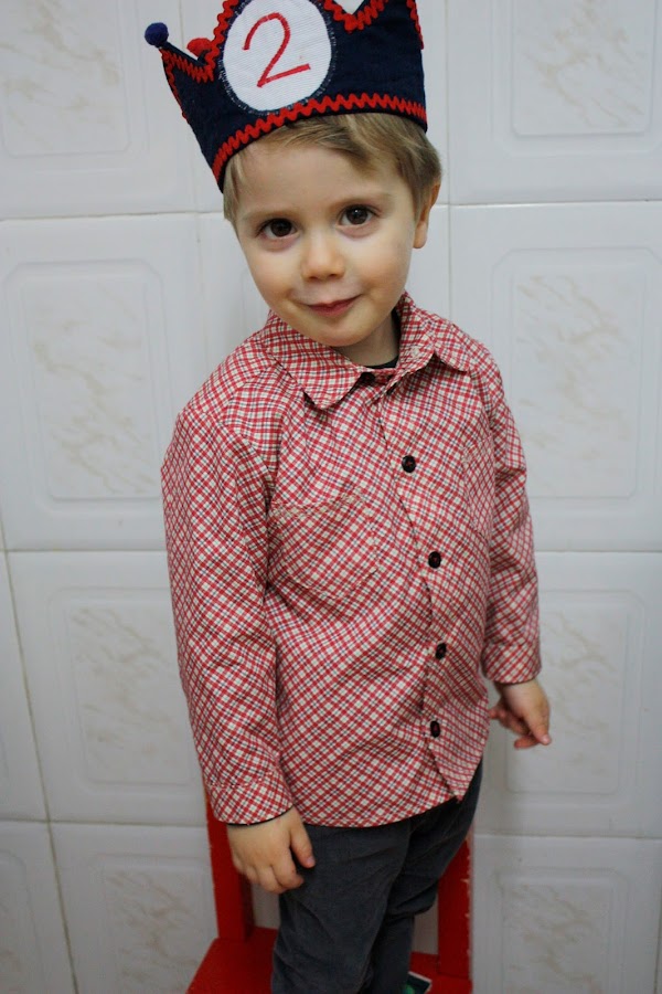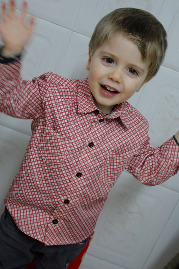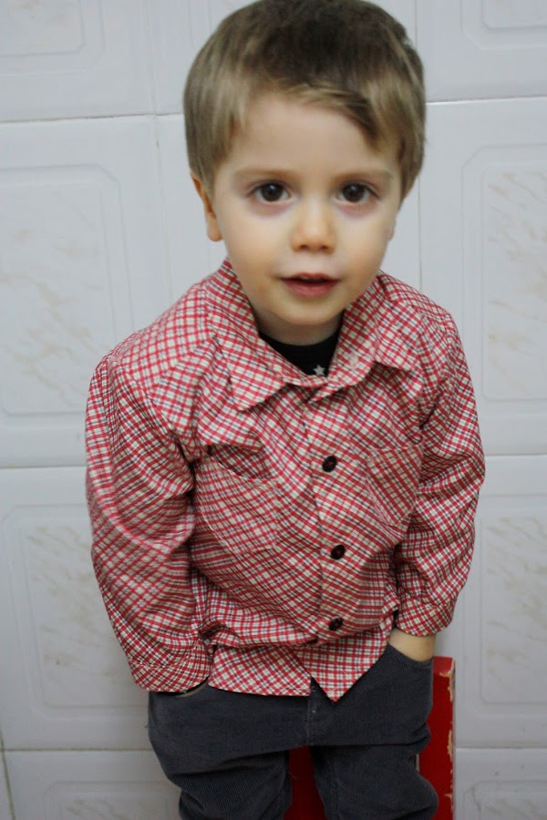 Esta en cuadros de color roja es con cuello camisero y manga larga es la última que he cosido y Eric esta tan contento con ella!!! Y yo más!!! Como dice él: "mami cotura"