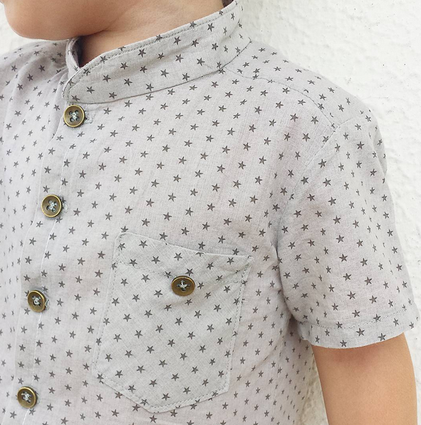 Y repeti modelo reciclando una camisa de lino de su padre, también con cuello mao, sin bolsillos y manga corta.