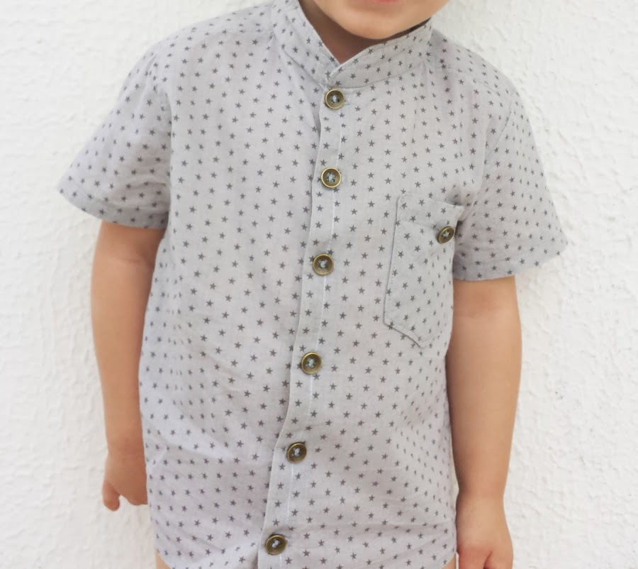 El modelo es a todo detalle como una camisa para adulto por lo que si haceís esta podeís hacer una en grande seguro!!! Tiene dos bolsillos, tapeta y puños con remate de biés.