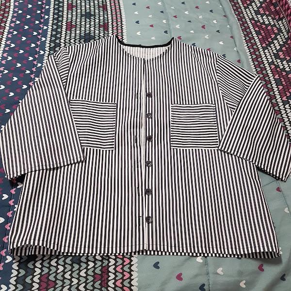 Para el modelo de la camisa , he probado un patron nuevo de corte mas bien anchito , no lleva pinzas ni en la parte delantera ni en la parte trasera , bolsillos de plaston en el delantero , mangas 3/4 anchitas y no lleva cuello camisero si no cuello redondo .