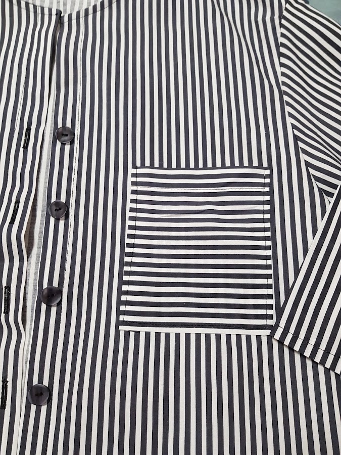 Los bolsillos son de tipo plaston y he querido jugar con las rayas , por eso las rayas en la camisa van en vertical y en los bolsillos las rayas van en horizontal de esta manera los bolsillos destacan mas en la camisa .