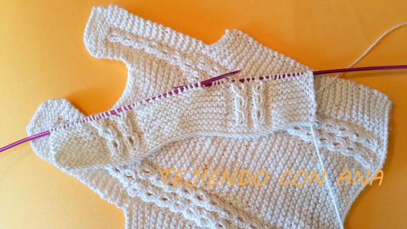 A 5 CMS, desde el ESCOTE, REDONDEAMOS EL TIRANTE disminuyendo al principio y al final de la vuelta, 2 veces 2 puntos, cerramos recto