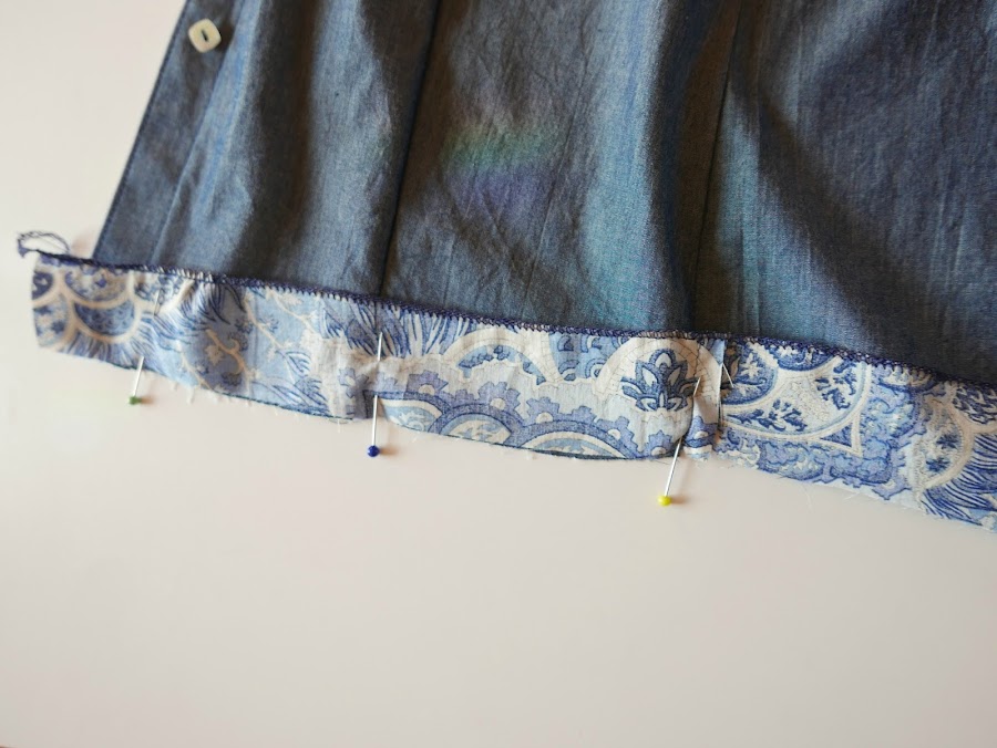 Primero saque del patrón las piezas del bajo y las corte dejando de tejido estampado sólo 5cm que irá hacia adentro. Uní las costuras laterales y sobrehilé los bordes superiores.