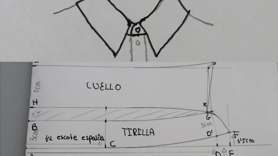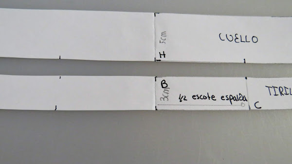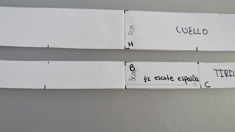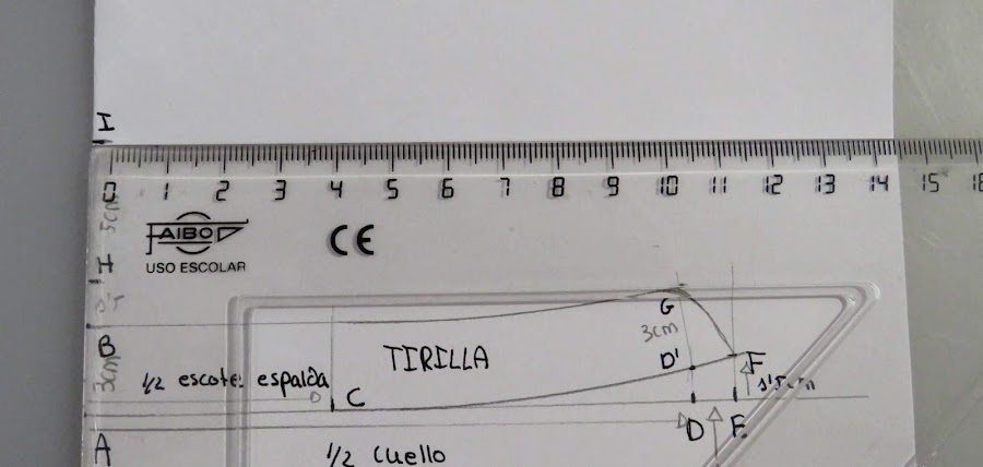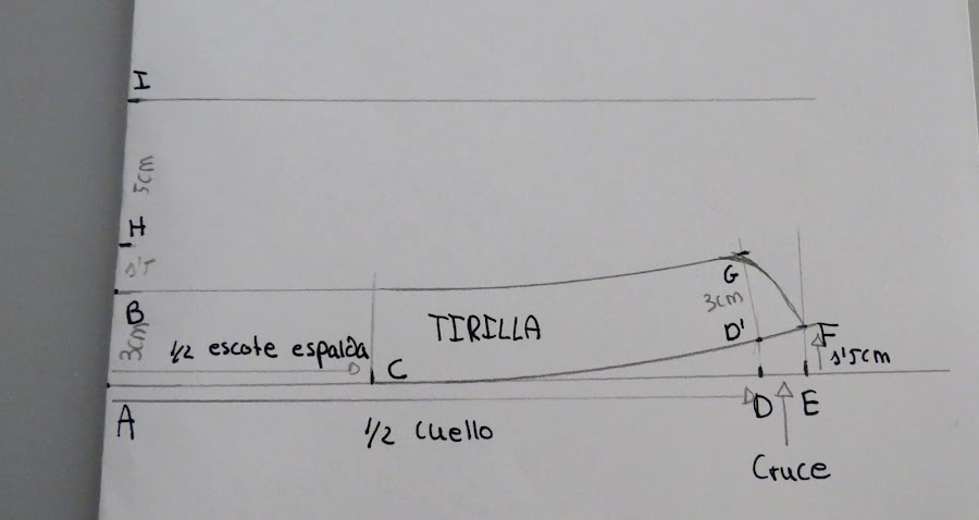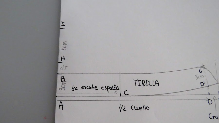 H-I: Marcar el ancho del cuello. La medida será 2 cm más que la medida de tirilla, por ejemplo, si pusimos una tirilla de 3 cm, marcamos un ancho de 5 cm.