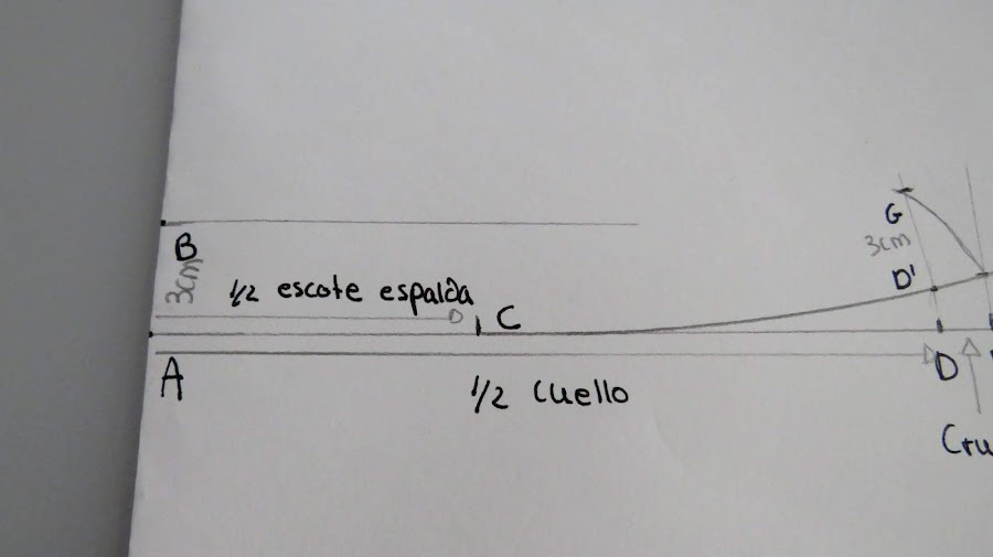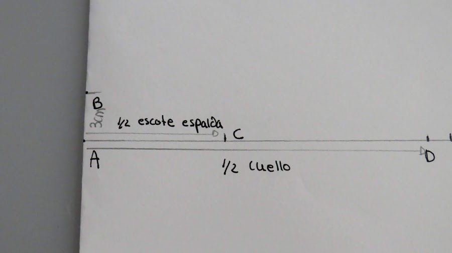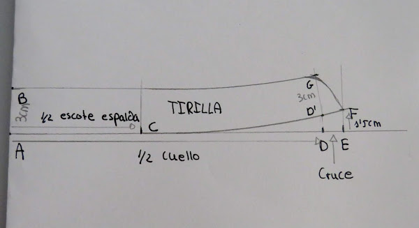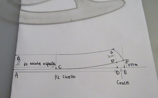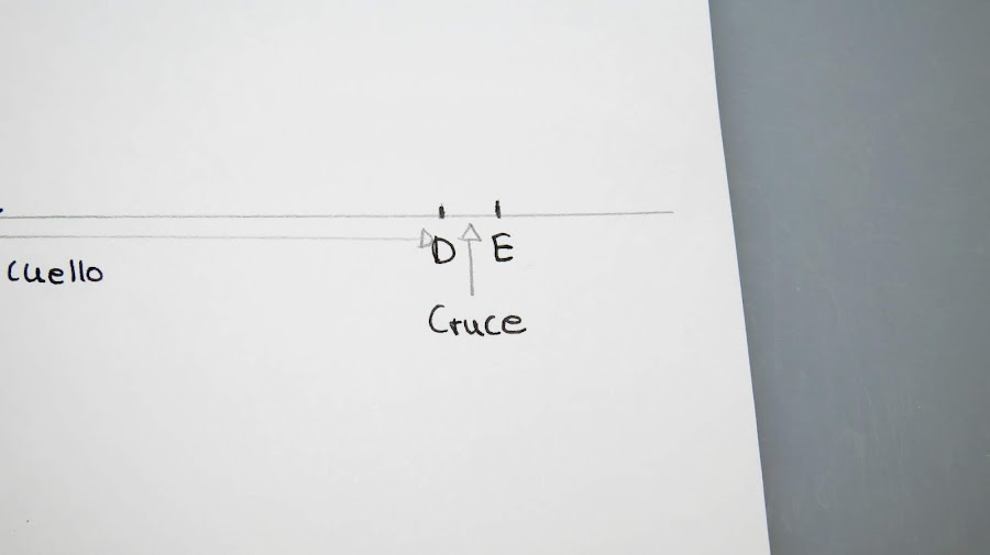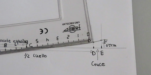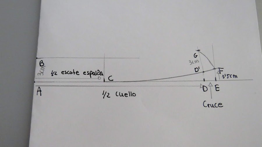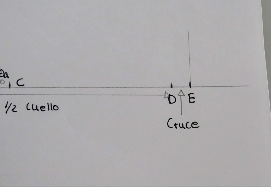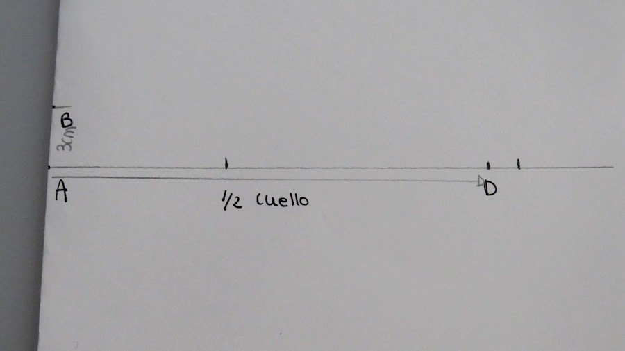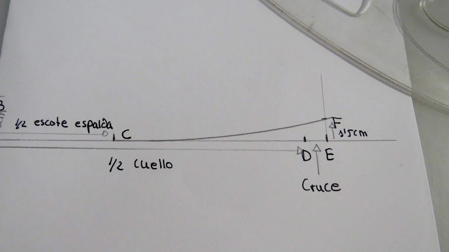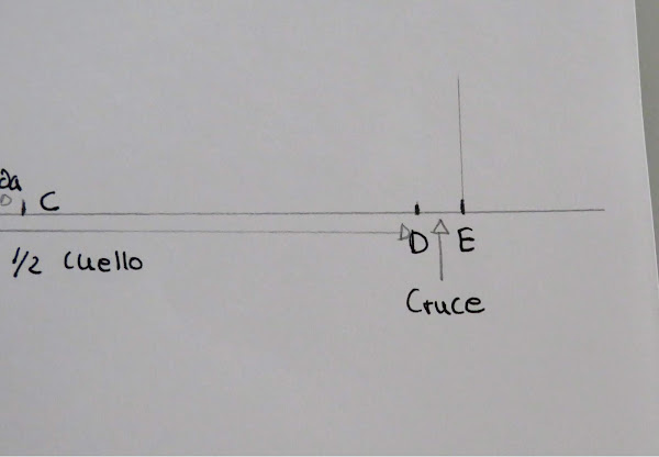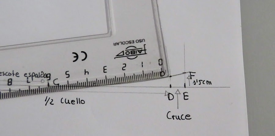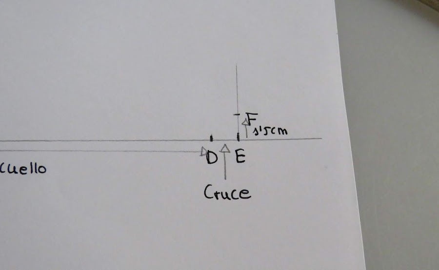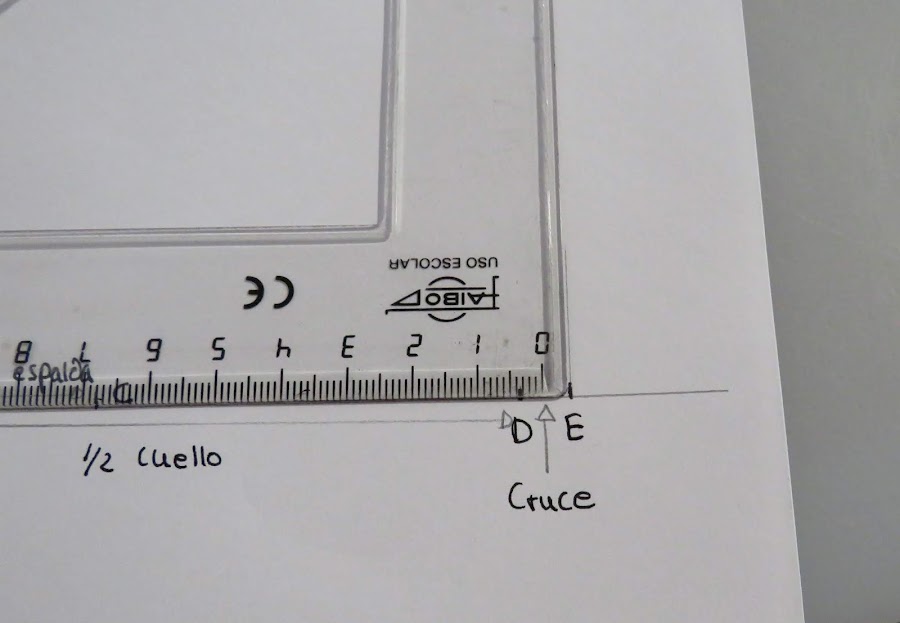 Sobre esa línea marcamos la medida de la mitad del cuello (Cuello delantero+Cuello espalda) más el cruce