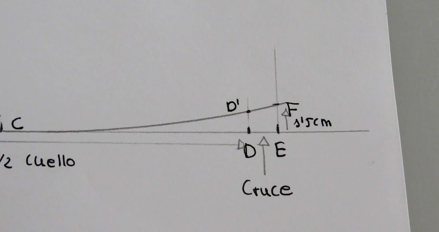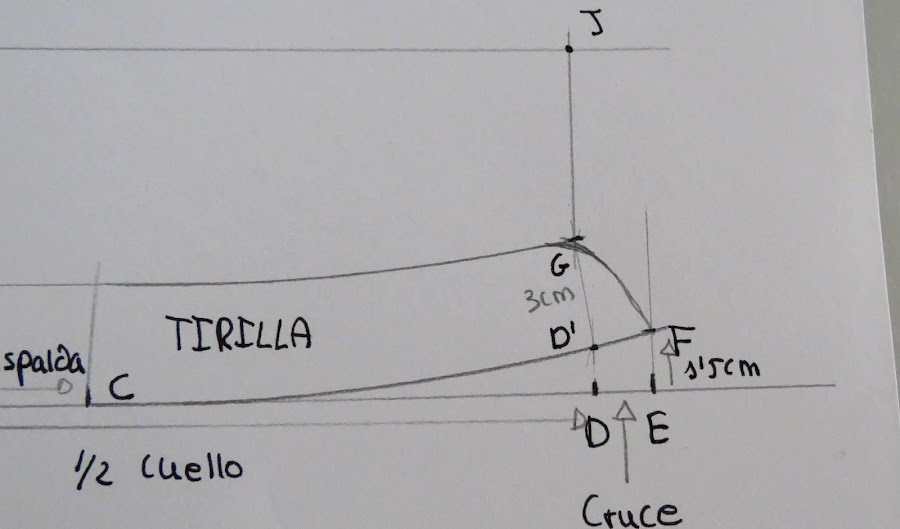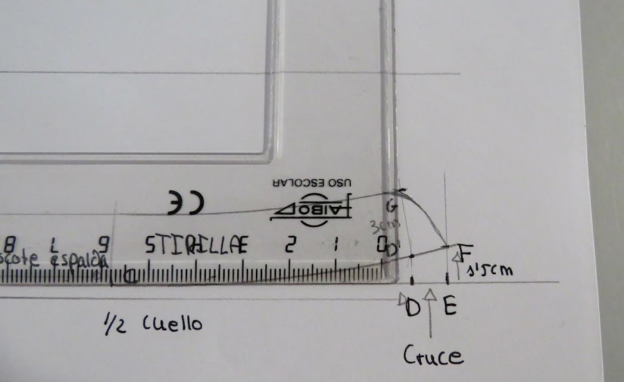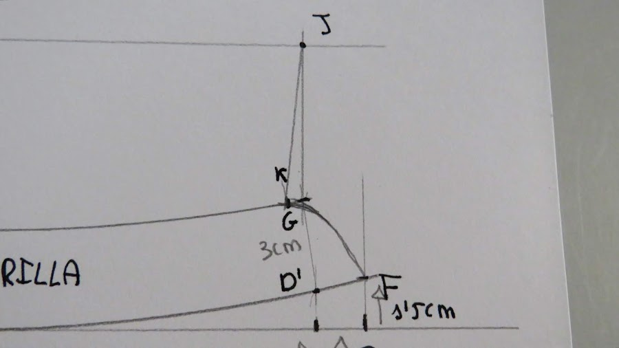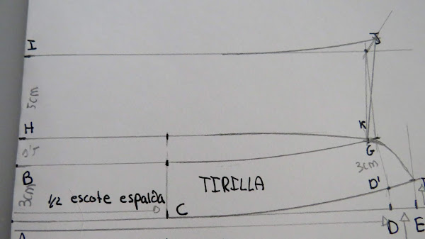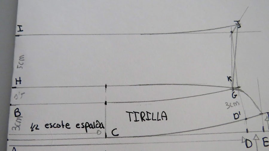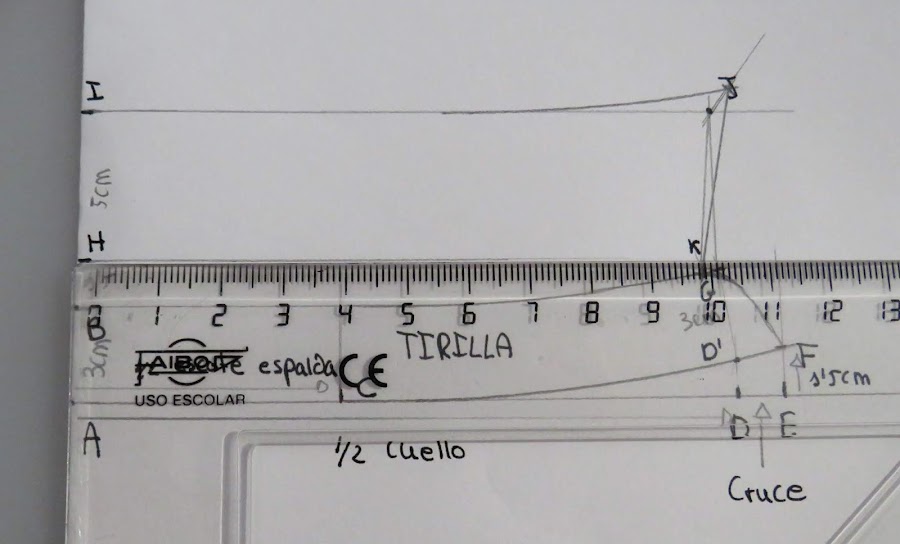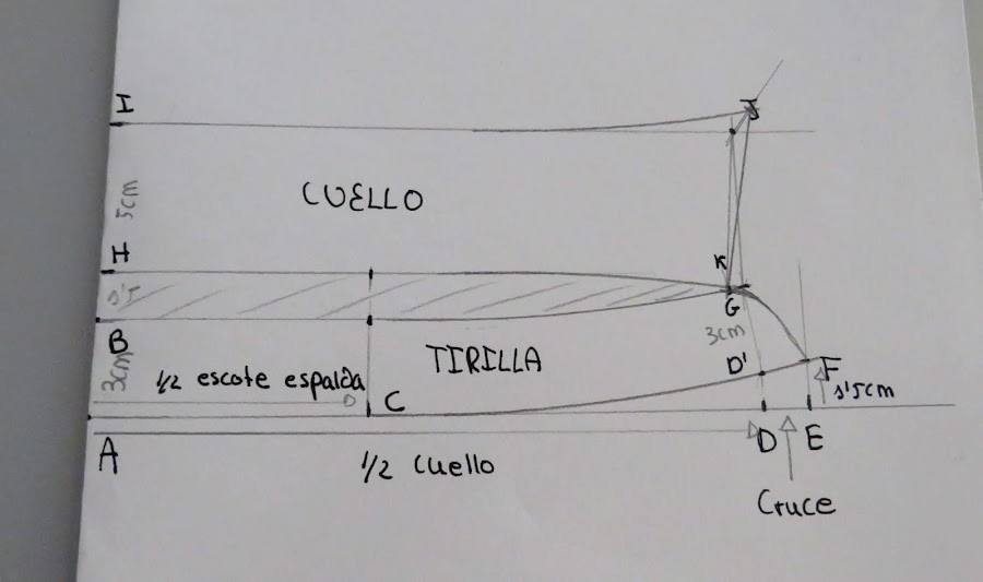 Desde el punto J, es donde podemos ir dándole distinta forma al cuello, con más o menos punta, redondeado o en pico, etc...Yo te enseño una medida estándar, pero tu puedes ir haciendo distintas pruebas para ir probando