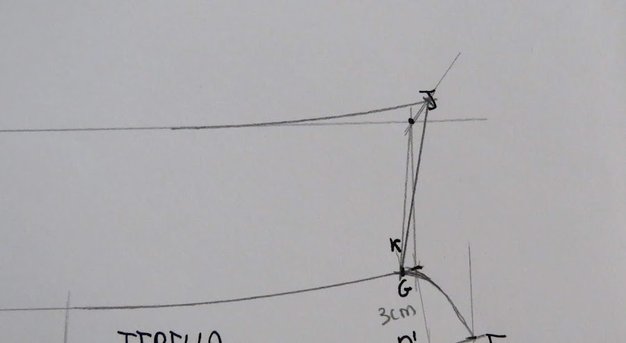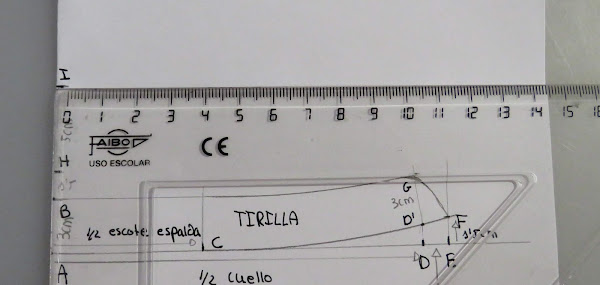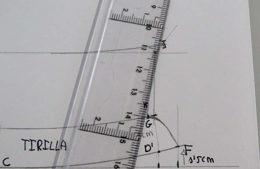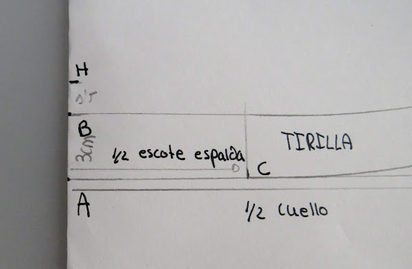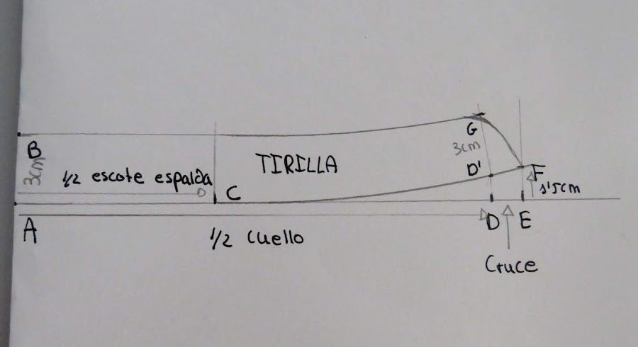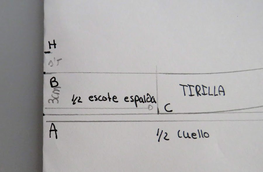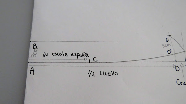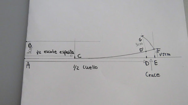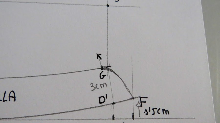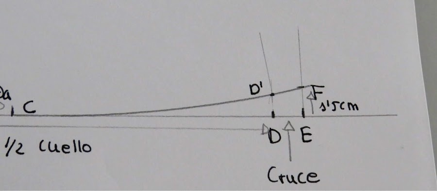 Desde el punto J, es donde podemos ir dándole distinta forma al cuello, con más o menos punta, redondeado o en pico, etc...Yo te enseño una medida estándar, pero tu puedes ir haciendo distintas pruebas para ir probando