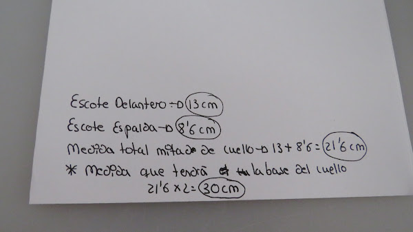 Anotamos las medidas. Estas que yo he puesto son de ejemplo:-Escote Delantero: 13 cm