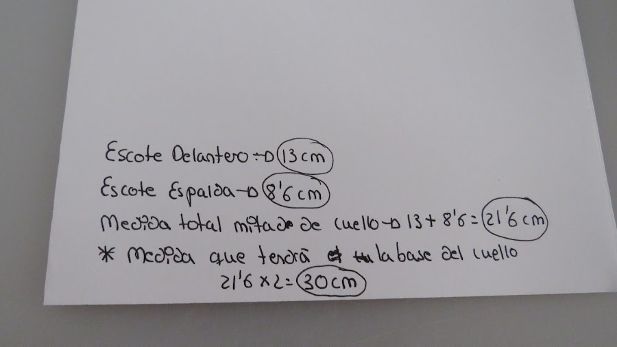 Por lo que, la medida que tendrá nuestro cuello en total serían 30 cm, porque multiplicamos 21,6*2, pero las medidas anteriores con las que necesitarás para tu patrón, obviamente con tus medidas, estas son de ejemplo