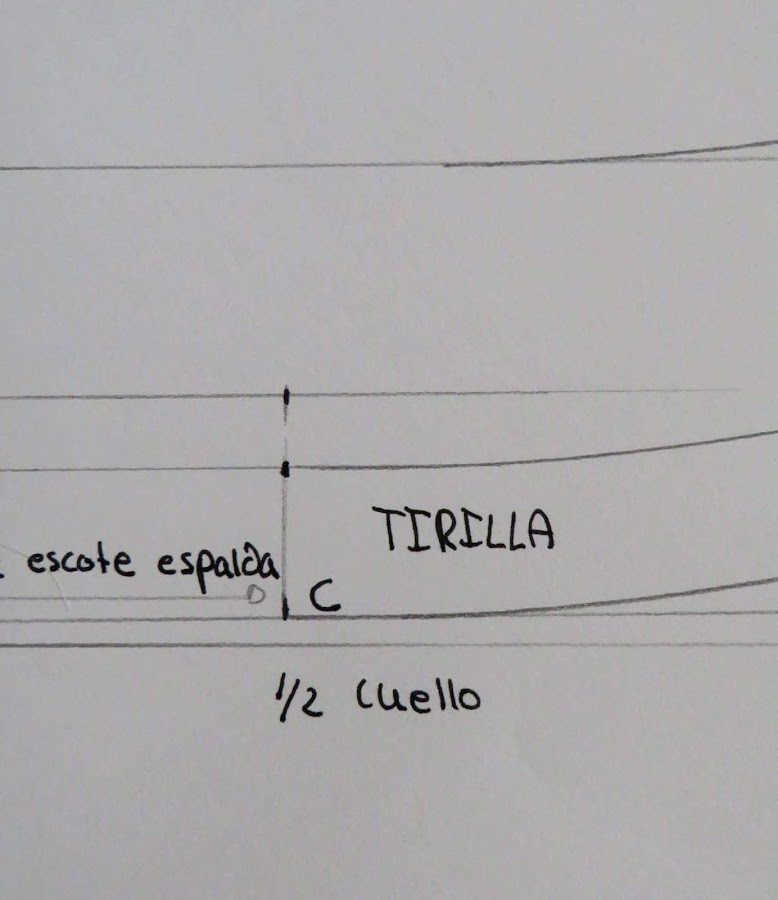Sobre esa línea marcamos el piquete del punto C, tanto en ambos lados de la tirilla, como en el cuello que va unido a la tirilla. Esto nos ayudará a la hora de confeccionar la prenda