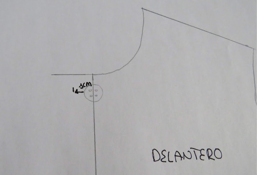 Situamos el botón que vayamos a utilizar para la prenda y lo colocamos justo en la línea del centro de la prenda. A partir del extremo del botón, medimos 1 cm hacia fuera. Esa medida será el ancho del cruce.