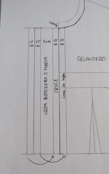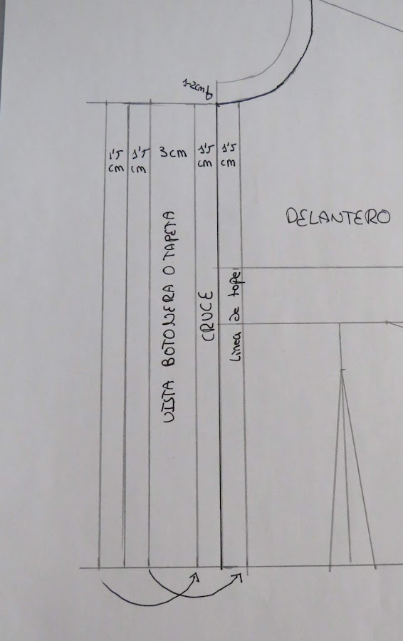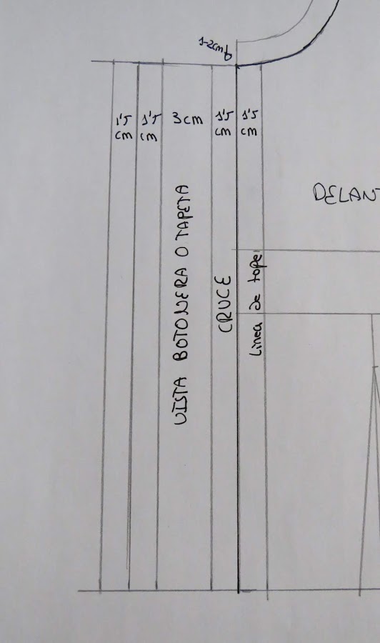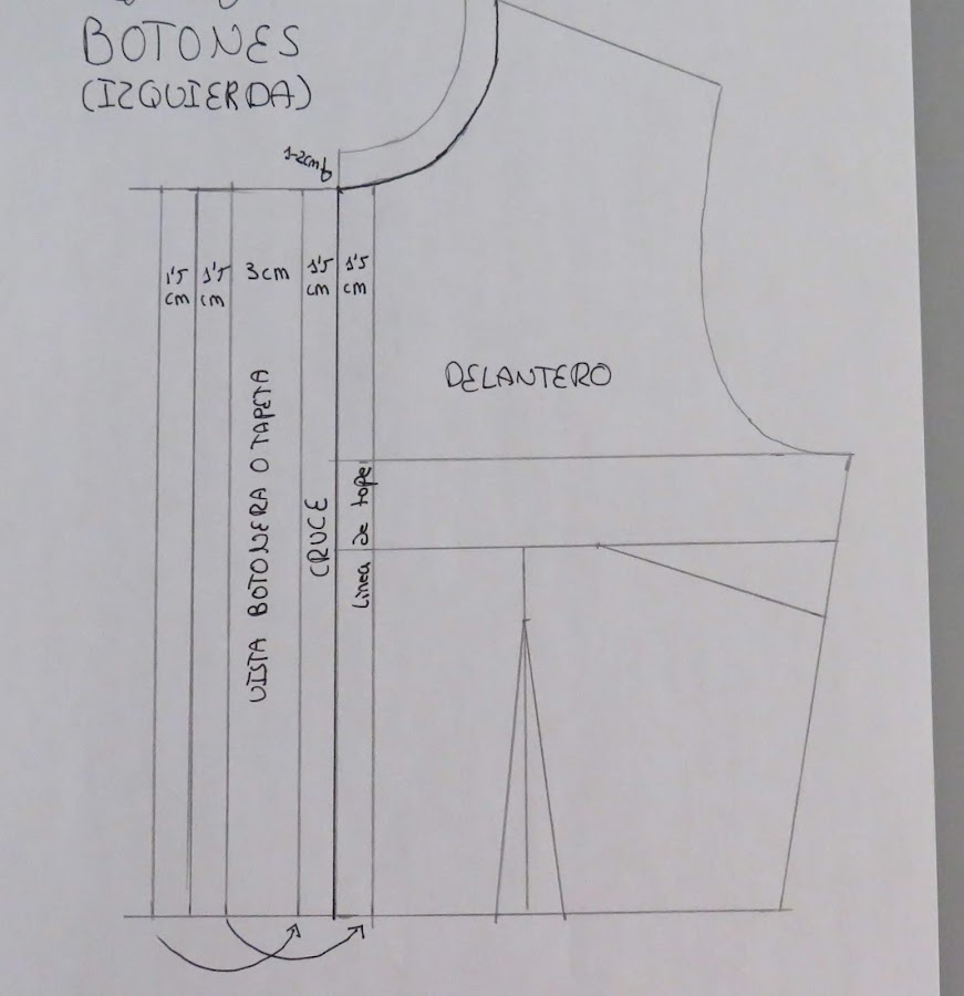 Desde la línea del centro de la prenda, es decir, la línea inicial que teníamos, la cual he marcado en negro para diferenciarla de la transformación, marcamos nuevamente ese 1,5 cm hacia dentro, esa será la línea de tope de la tapeta, es decir, tenemos dibujado cómo quedaría la tapeta una vez confeccionada. Nos quedaría de un ancho de 3 cm en total, aunque para las camisas, generalmente, se suele usar un botón más pequeño, por lo que no suelen ser tan anchas.