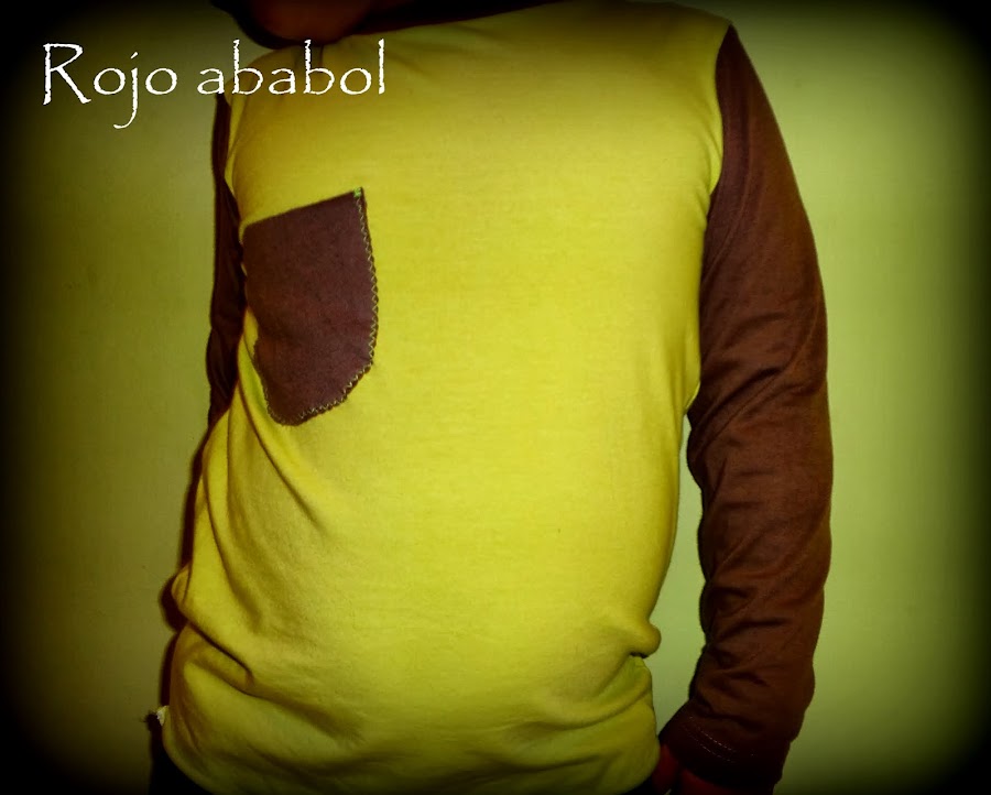 Cosí toda la camiseta con la overlock y el bolsillo lo apliqué con una puntada zigzag a contraste. Los dobladillos de las mangas son los de la prenda original y en el bajo no hice ninguno, no me importa que quede un poco enrollado.
