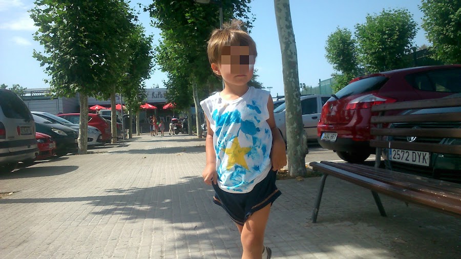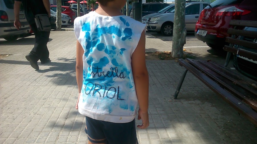 La sorpresa vino cuando volvió del casal, que cosa más bonita! Por tod@s es sabido que me encanta tunear las prendas, estampar, pintar telas... Pues así volvió la camiseta del casal: