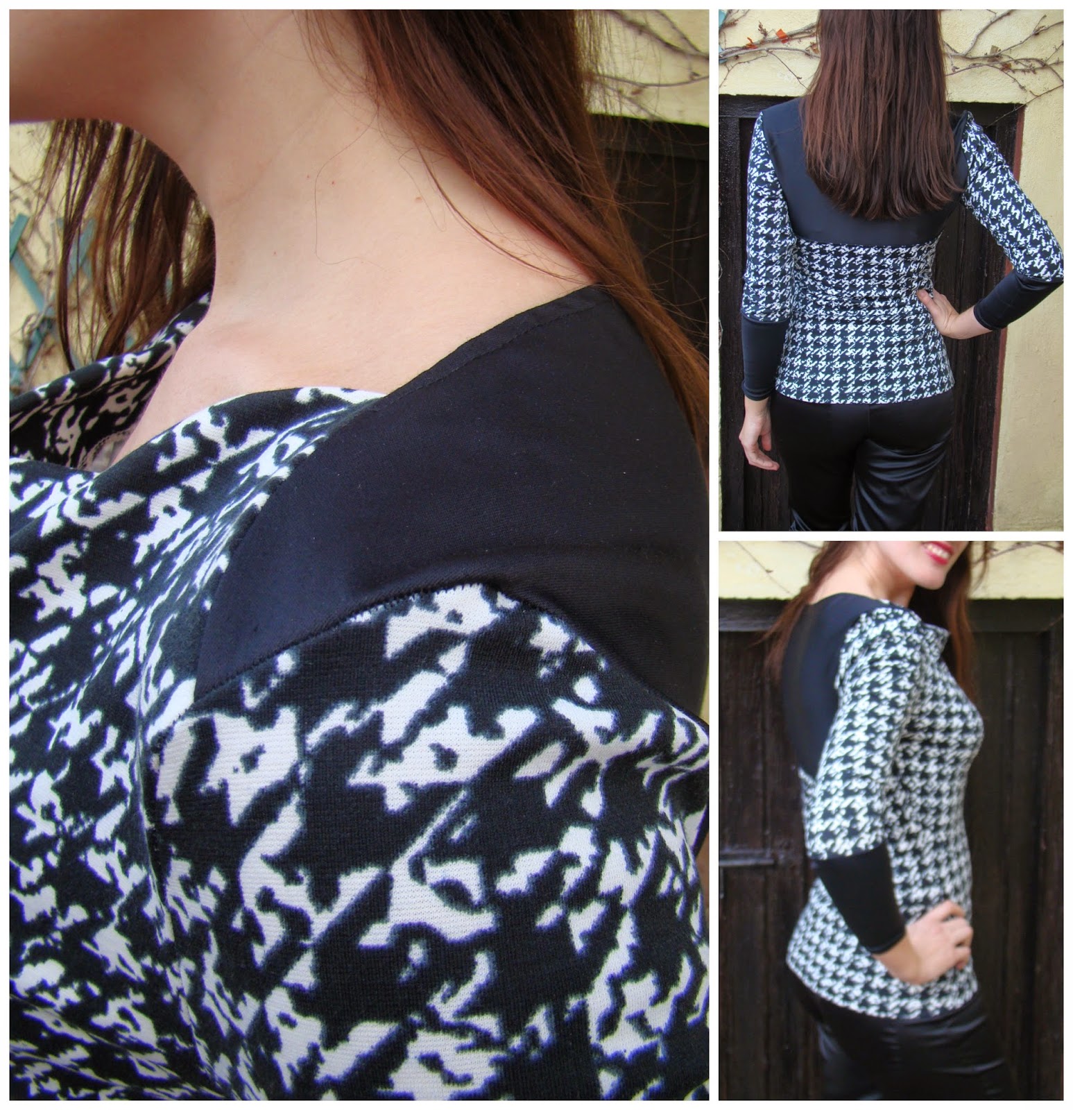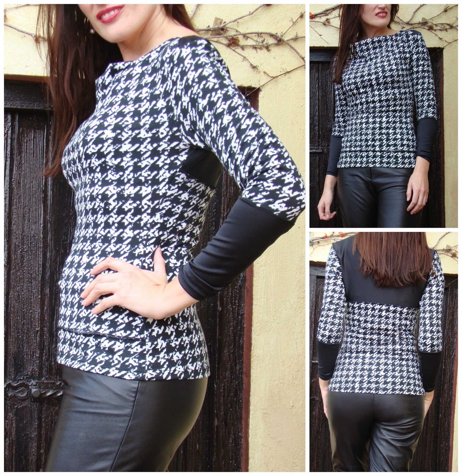 El caso es que el blanco y negro me encanta y el año pasado compré un pequeño retal de punto de Roma de pata de gallo, pero poca cantidad para hacer una camiseta sólo de esa tela, así que combinando un poco y con el modelo adecuado, al final la he conseguido.