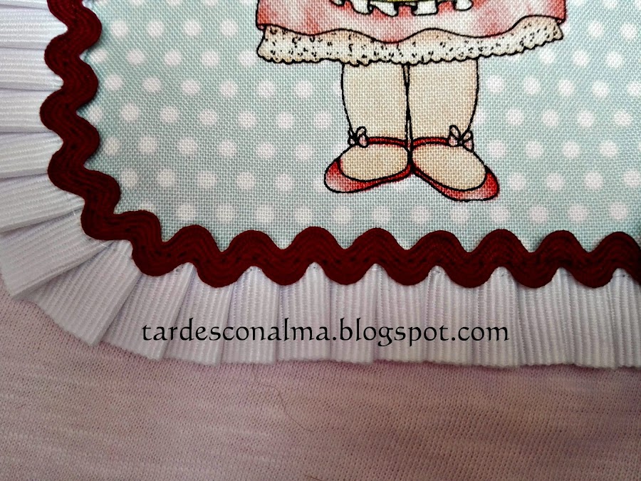 Empezaremos en la esquina inferior derecha sujetando con alfileres la cinta plisada de color blanco, a unos 3 o 4 mm del borde, al rededor de la muñeca redondeando un poquito los extremos.