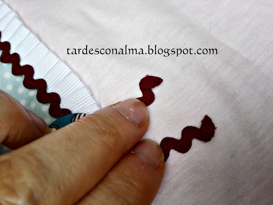 Hacemos lo mismo con la piculina, pero dejando unos centímetros sin coser al principio y al final para que "cuelguen", una más larga que la otra. Rematar a puntada escondida las puntas doblando sobre si misma de pico en pico. De esta forma conseguiremos que no se deshilache y quedará más bonito.