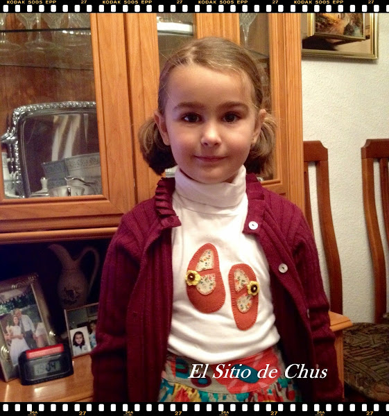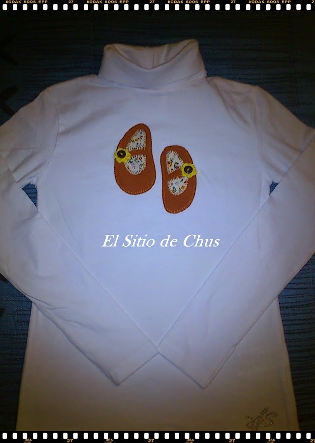 Hoy os vengo a enseñar una camiseta que hice por encargo de mi amiga Esther. Vio la que le hice a Teresa (pincha aquí si la quieres volver a ver), y me pidió que le hiciera una para su sobrina. De los dibujos que tenía, eligió estos zapatitos tan monos, y éste fue el resultado.