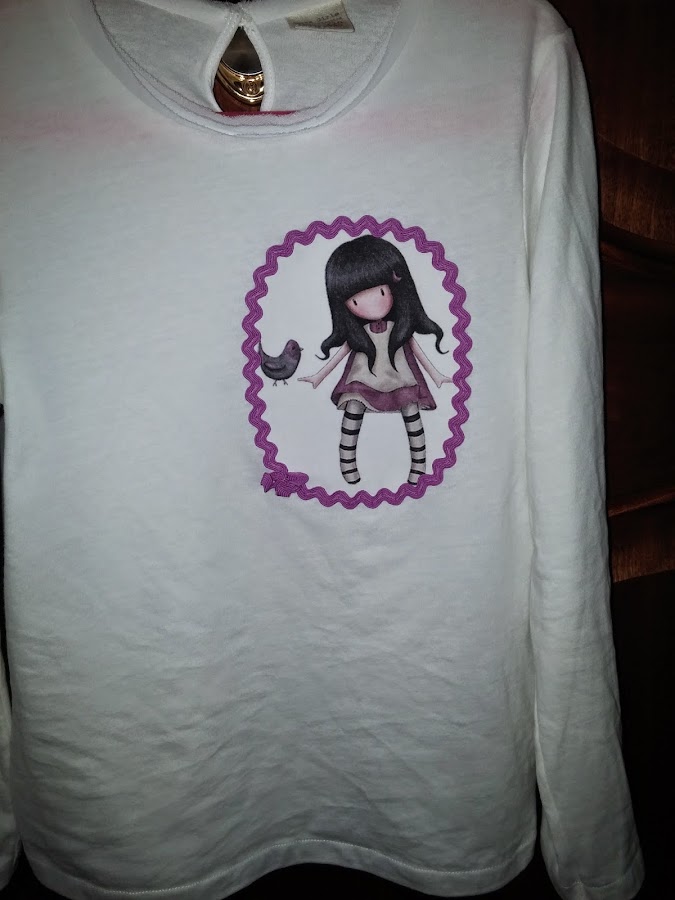 Esta camiseta fue todo un reto, mi amiga quería algo gótico, alguna calavera......un toque siniestro pero que fuera completamente de mi estilo, y mi estilo es todo menos siniestro, y quería una muñeca, -pero que te dejo libertad creativa- me dijo. Con este panorama, y mirando fotos de otras de mis camisetas, no veía por donde meterle mano y me acordé de las Muñecas Gorjuss (por si algun ...