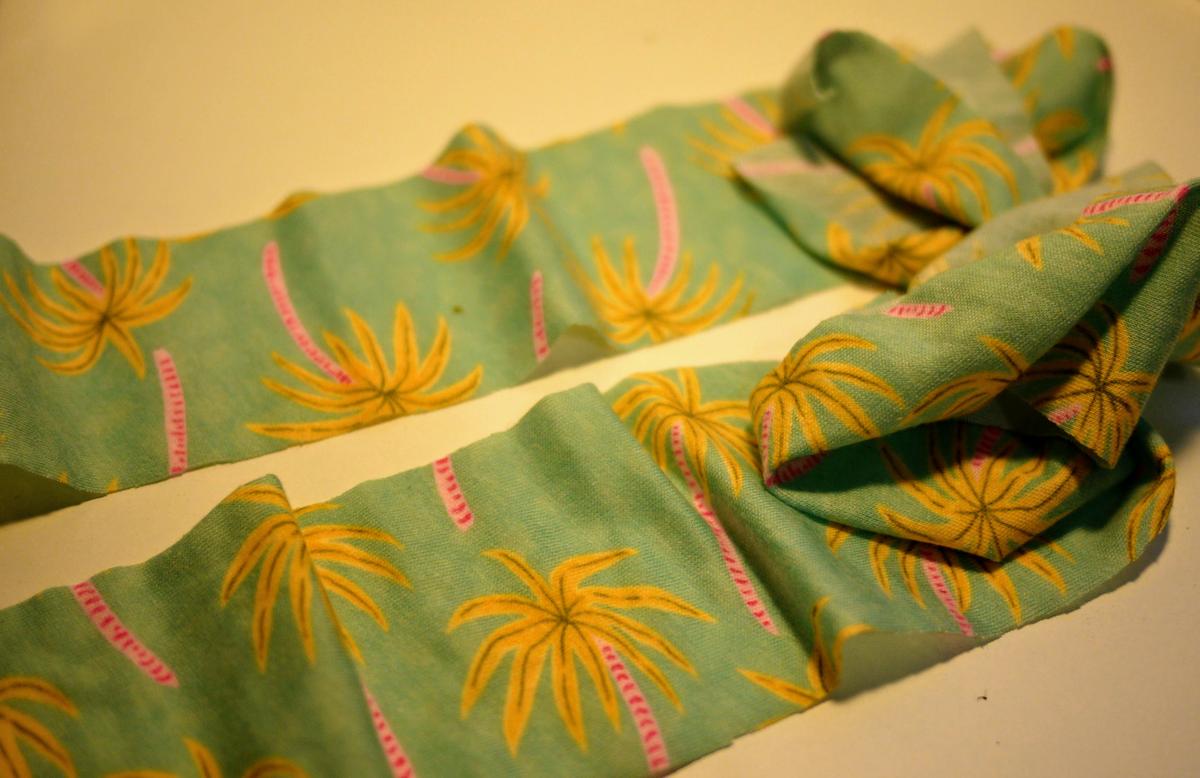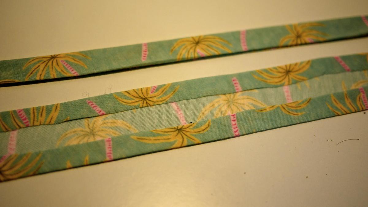 Una vez cortadas y con la ayuda de la plancha he doblado 1,5 cm a lado y lado de la tira para crear una especie de biés. Después he doblado otra vez por la mitad la tira, como veis en la foto: