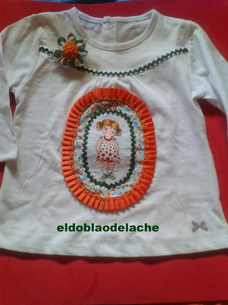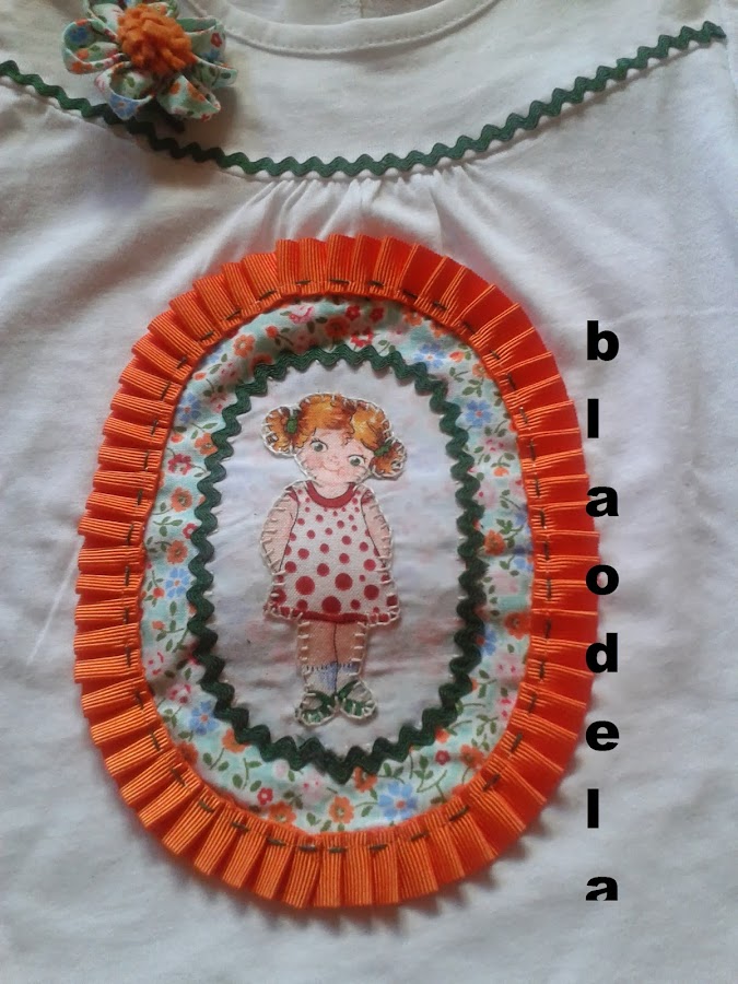 Camiseta decorada con recortable en tonos rosas y violeta con pasamanería. Diadema a juego