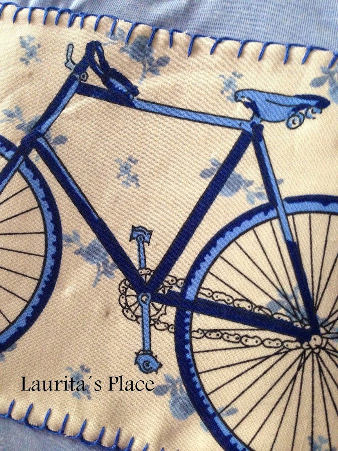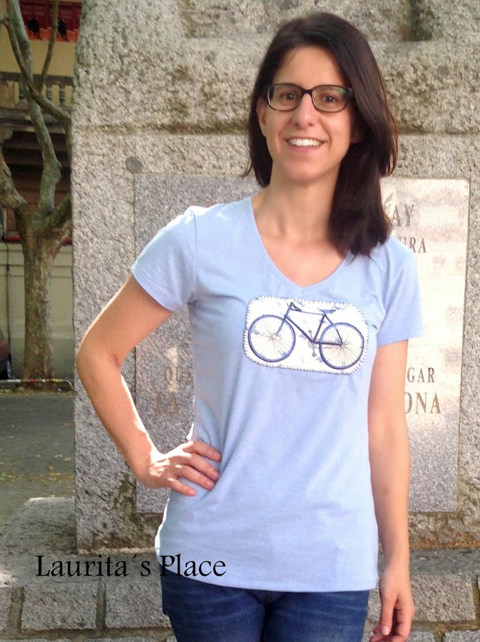 Decoré esta camiseta básica en tono azul, con una bicicleta de una tela que compré en una escapada a Oviedo.