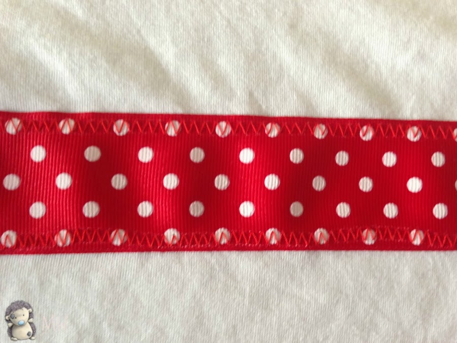 Lo primero es cortar y coser las tiras rojas a lunares. Las cortamos un poco más cortas que el ancho de la camiseta, las pegamos con la cinta para dobladillos (o cualquier entretela adhesiva de doble cara) y las cosemos a la camiseta con un zigzag.