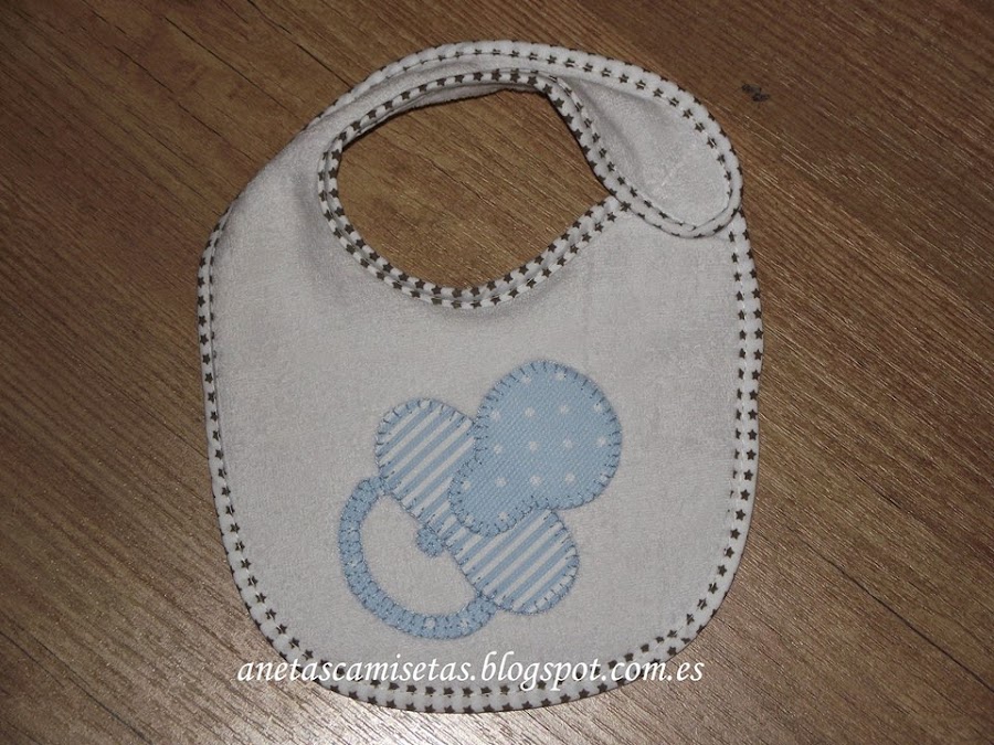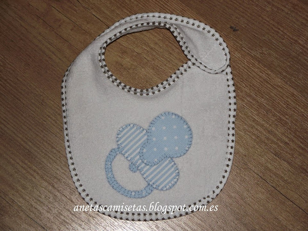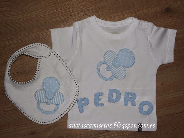 Mirad que camiseta de bebé más simpatica con un gracioso chupete en tonos celestes a juego con su babero. Es para un pequeñin que está a punto de nacer y que se llamará Pedro.