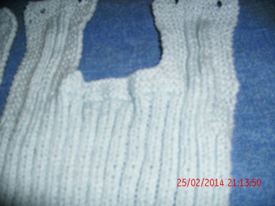ESTA CAMISETA LA TEJI EN PUNTO ELASTICO, O SEA DOS DERECHOS Y DOS REVES, LA TEJI CON LANA FINA PARA BEBE CON AGUJA NUMERO 3 Y MEDIO, COLOQUE 120 PUNTOS EN LA AGUJA Y LA TEJI TODA ENTERA, LA PARTE DE ABAJO, TIENE SOLO UNA COSTURA EN UNO DE LOS LADOS, TEJI 18 CM. Y DIVIDI EL TEJIDO EN DOS, DISMINUYENDO 2 PUNTOS EN EL CENTRO PARA SEPARARLAS Y TEJI 4 PUNTOS EN SANTA CLARA PARA FORMAR LA SISA, TEJI 2 CM. MAS Y DIVIDI EL RESTO DE PUNTOS EN DOS Y DEJE 12 PUNTOS DE CADA LADO PARA FORMAR LOS TIRANTES Y LO QUE ME QUEDABA EN EL CENTRO LOS TEJI EN SANTA CLARA O PUNTO BOBO ( TODO PARA ABAJO O TODO EN DERECHO DE LOS DOS LADOS), LOS TIRANTES LOS TEJI COMO ESTABAN, EL PUNTO SANTA CLARA LO TEJI POR 6 VUELTAS PARA FORMAR EL BORDE Y LUEGO DEJE 4 PUNTOS DE ORILLA PARA EL ESCOTE QUE CONTINUABAN EN SANTA CLARA O BOBO Y DISMINUI LOS PUNTOS DEL CENTRO, FORMANDO ASI EL ESCOTE LOS TIRADORES DE ATRAS LOS TEJI 7 CM. DE LARGO Y LOS DE ADELANTE 8 CM.