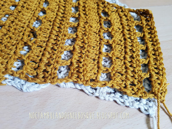 Vuelta 23: 20 pa en color ocre, cambiamos al color beige y hacemos 40 pa, cambiamos de nuevo al ocre y hacemos 20 pa más.