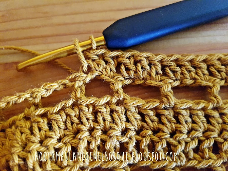 Vuelta 31: 20 pa en color ocre, cambiamos al color beige y hacemos 40 pa, cambiamos de nuevo al ocre y hacemos 20 pa más.