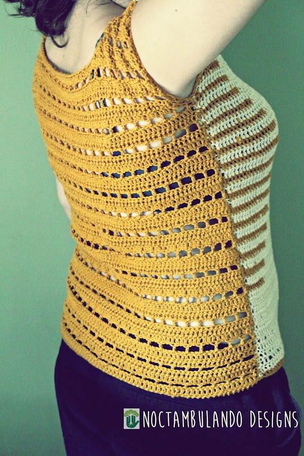 Es una camiseta sin mangas, por lo que está hecha sin necesidad de hacer disminuciones como normalmente se hace para las camisetas de tirantes, así que eso nos facilita la faena y no tendremos que ir contando más que para hacer el cuello. El resultado creo que es bastante molón.