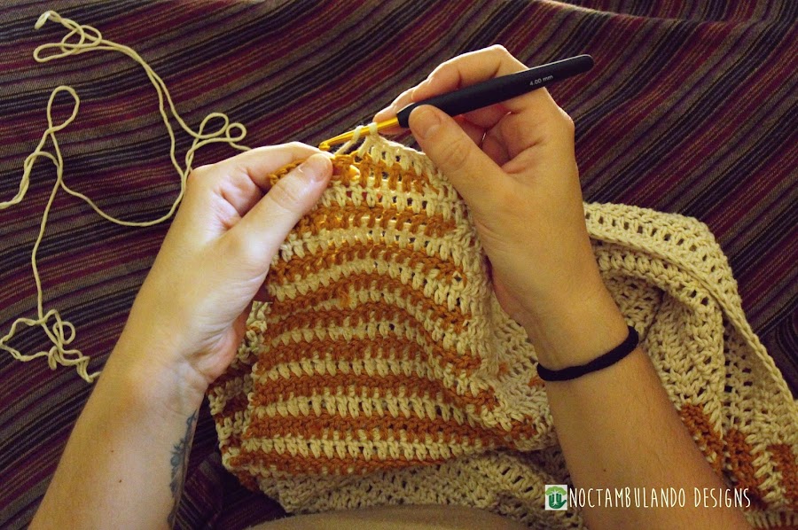 Vuelta 27: 24 pa en color ocre, cambiamos al color beige y hacemos 32 pa, cambiamos de nuevo al ocre y hacemos 24 pa más.
