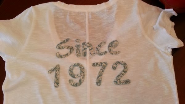 Como si de una auténtica marca registrada se tratara, hice el aplique de la palabra SINCE junto a su año de nacimiento (todavía confesable :-) en la espalda de la camiseta. Elegí una tela floral en tonos azules que me parece muy combinable. En las imágenes podéis ver el detalle.