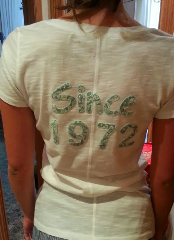 El próximo mes de Abril, cumple años una amiga muy especial. A ella le encantan mis camisetas de patchwork, así que me he puesto manos a la obra y le he confeccionado ésta. Quería que fuera algo especial para ella, que no resultara demasiado infantil y fuera vistosa. Me pareció que podía resultar divertido incluir su año de nacimiento en el diseño.