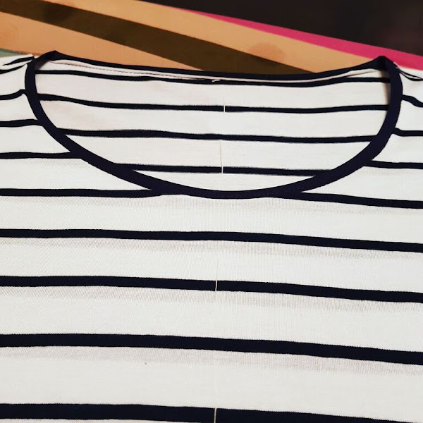 El cuello es redondo y lo he trematado con cinta al bies de color azul marino , esta vez el bies lo he dejado por fuera , ya que me parecia mas bonito asi y ademas hace juego con las rayas azul marino.