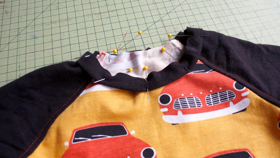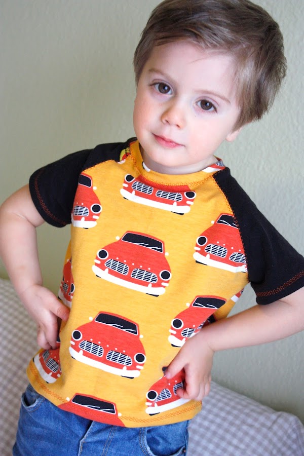 En un primer momento le puse el biés en negro pero luego al hacer la segunda camiseta vi que me gustaba más como quedaba con la tela de los coches y corte una tira al biés de la misma tela y con ella remate el escote de las dos camisetas. Usando además una puntada decorativa que veréis en las fotos con modelo.