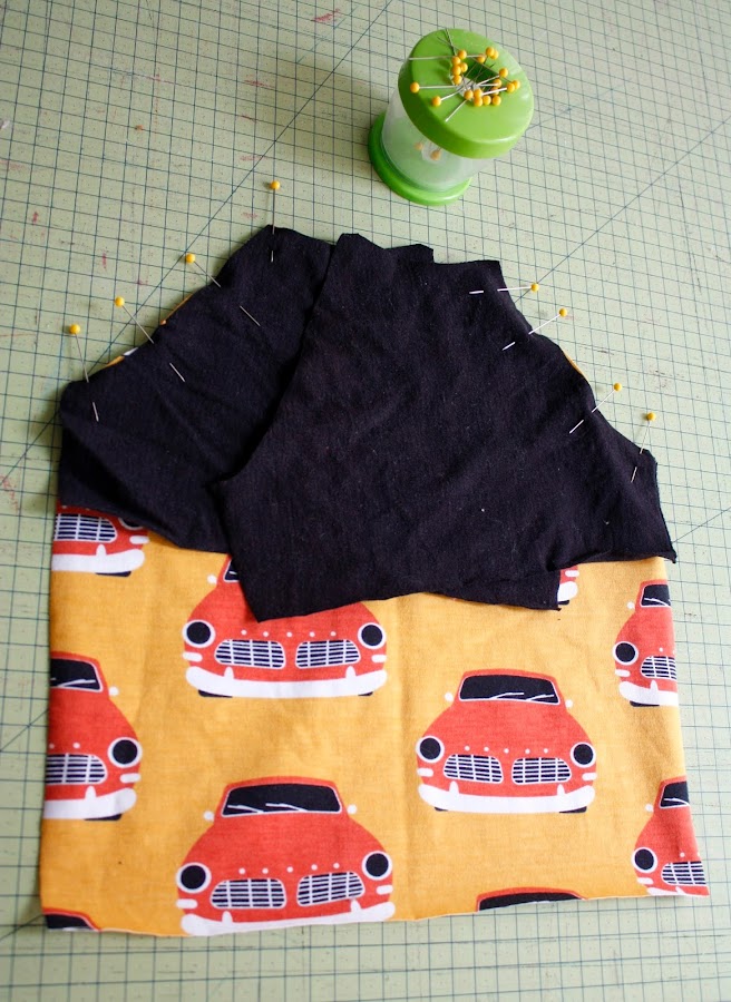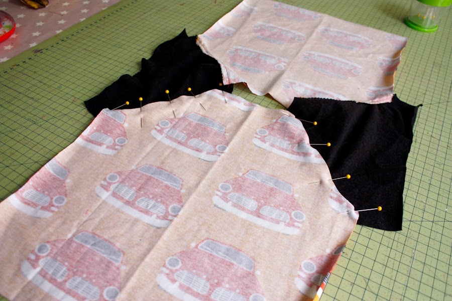 Los pespuntes decidí darselos en naranja a juego con los coches para que destacará. Os voy a explicar paso a paso como confeccionarlas con una máquina de coser normal doméstica sin necesidad de una overlock. (Todo hay que decirlo con la overlock todos los remates quedan mejor y para coser este tipo de tela de camiseta es perfecta, porque cose y remalla a la vez por lo que es rápidisimo de confeccionar).