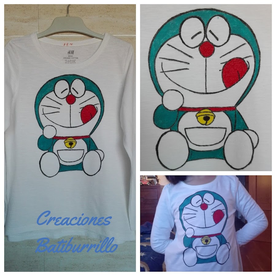 Está pintada con rotulador permanente negro y pinturas acrílicas. Una vez seca, pasamos la plancha con una tela encima o papel de horno.